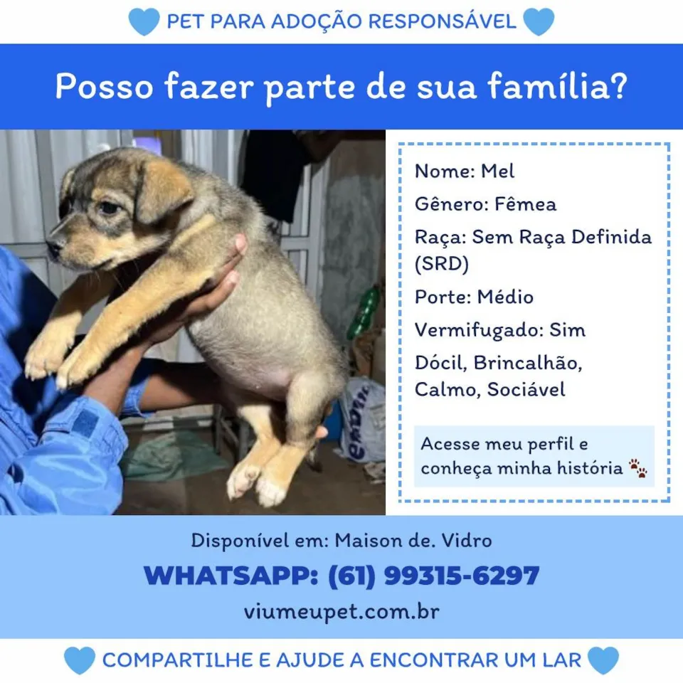 A Mel é vermifugada e possui um temperamento adorável: é dócil, calma e brincalhona, sempre pronta para alegrar o seu dia. Sua natureza sociável faz dela uma ótima amiga, tanto para crianças quanto para outros cachorros e até para desconhecidos!