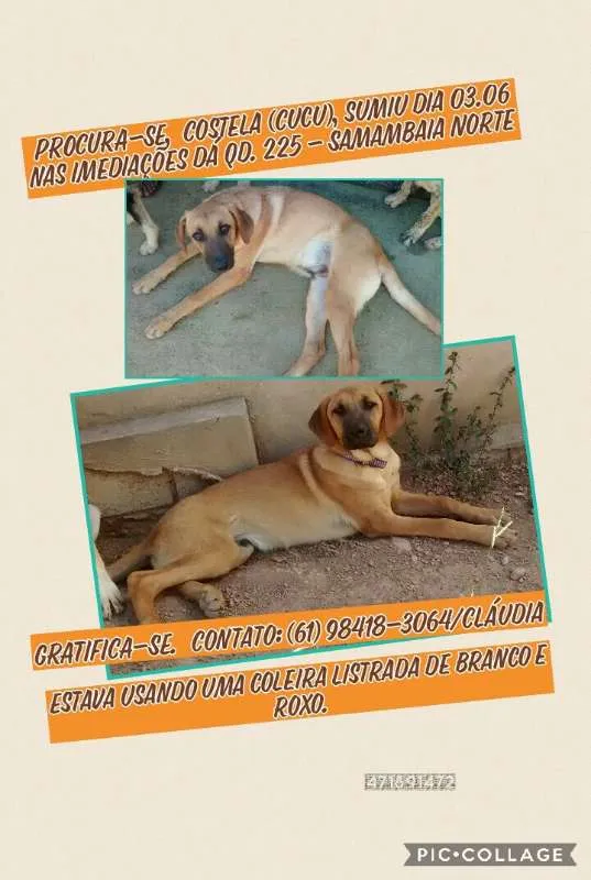 Costela fugiu da Quadra 225 Conjunto 3 da Samambaia Norte na manhã de sabado. Isso aconteceu apos uma briga com outro cachorro, portanto deve estar machucado. Ele esta com uma coleira listrada de roxo e branco. Gratifica-se quem encontrar.