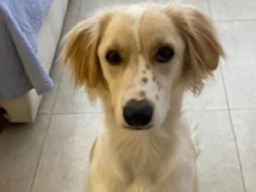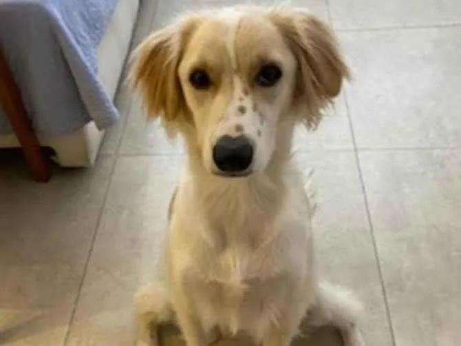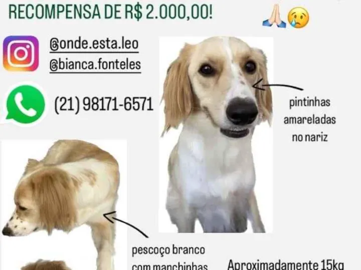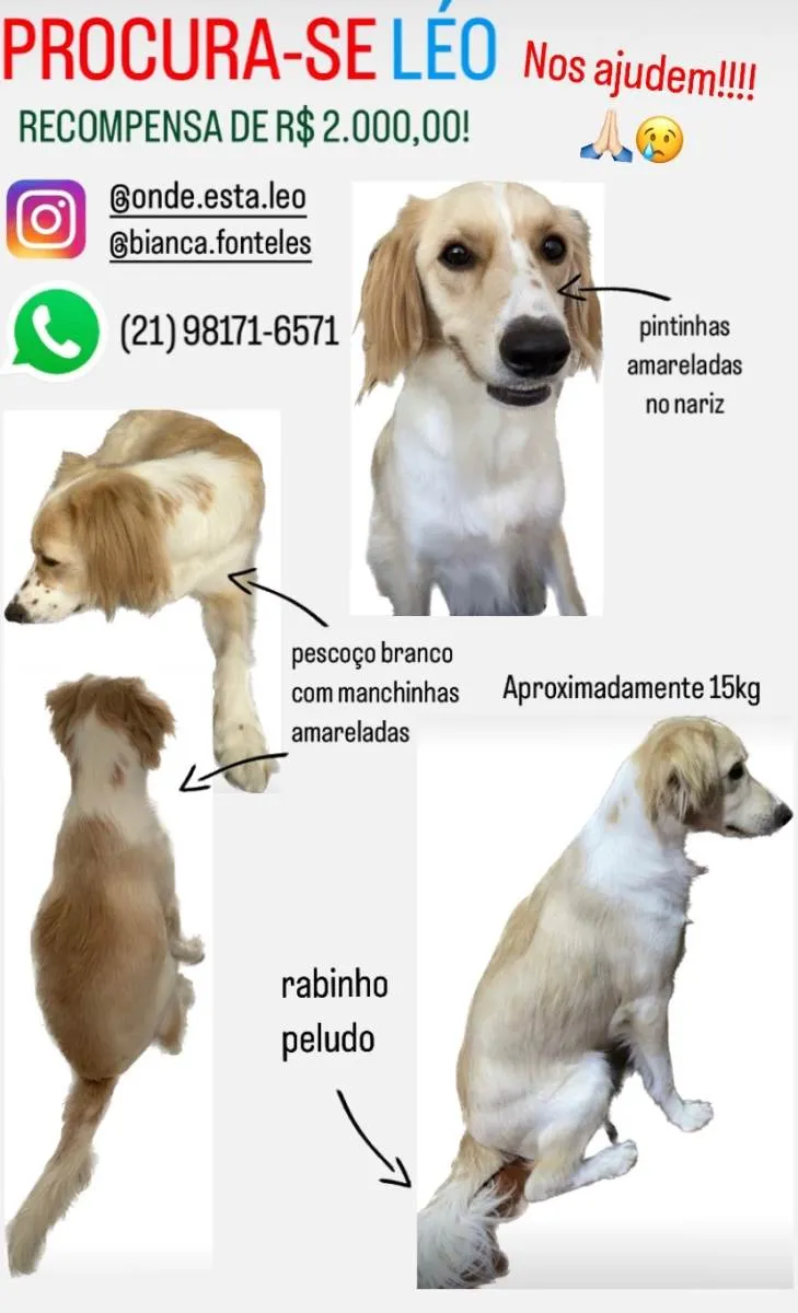 O Léo é um vira lata castrado de 2 anos e meio. Sua cor é branca com amarelo dourado. Rosto e orelhas nesse tom de amarelo. Focinho branco com pintinhas amarelas. As costas e o rabo são amarelo/bege e a barriga e peito, brancos. Ele tem pintinhas nas patas dianteiras também.