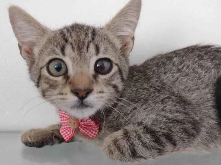 Possui três meses, está vacinado e vermifugado. É super dócil. Tem uma cicatriz no olho direito porque se machucou na época em que estava nas ruas, mas é super saudável, não é doença, apenas questão estética.