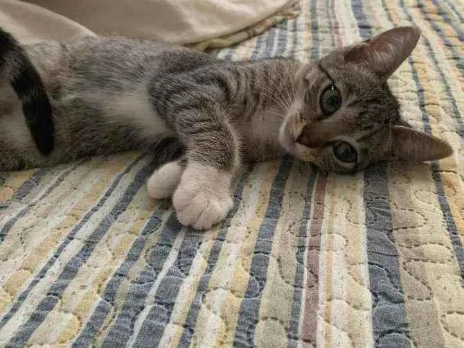 Olá tudo bem! sou um gato bastante carinhoso e alegre. Tenho apenas 3 meses de vida. Já sou verfimungado. Minha raça é Rajado com as patinhas brancas.