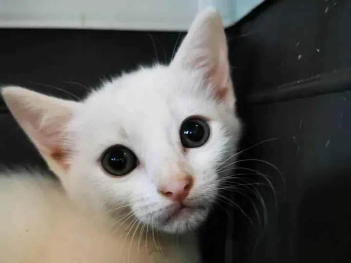 Gatinha branca com manchinha resgatada há uma semana precisa de um lar para adoção responsável.