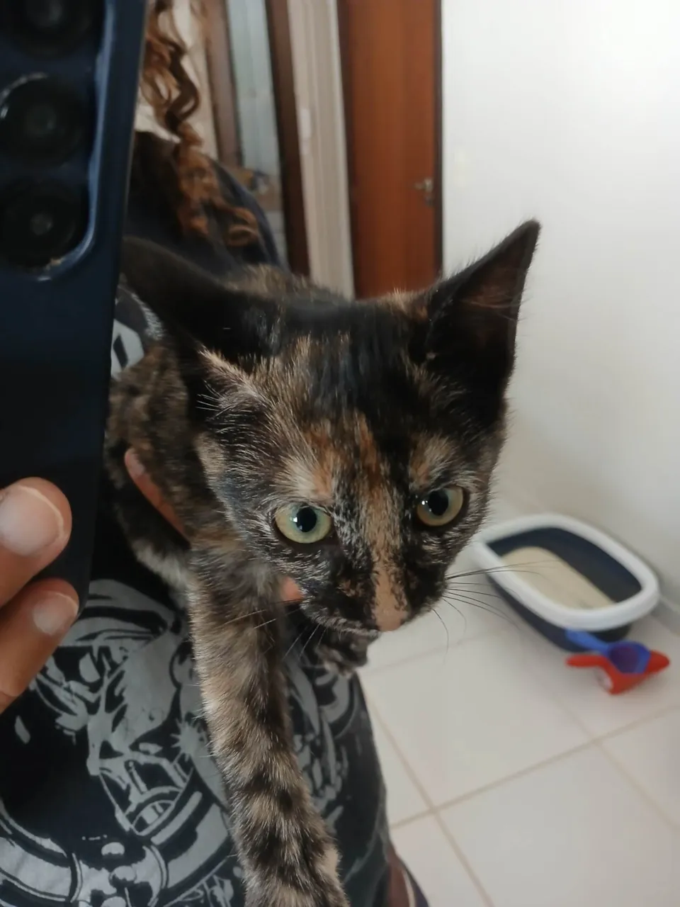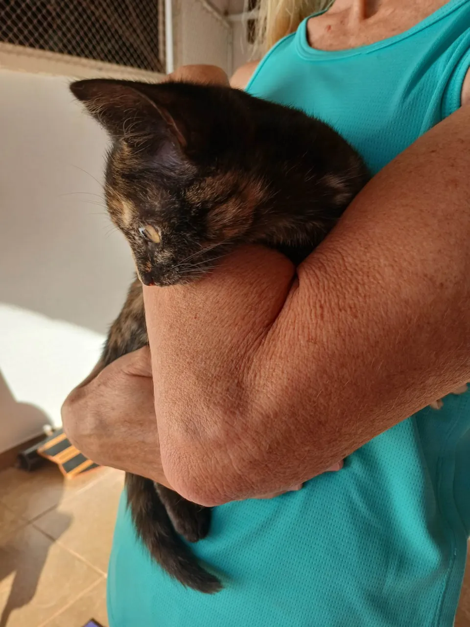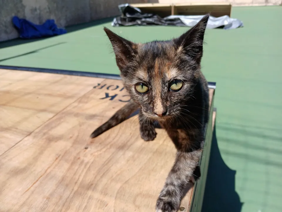 Esta gatinha escaminha foi abandonada junto com a mãe em uma escola infantil. Tem uma pelagem escaminha em que as manchinhas estão ficando cada vez mais preponderantes. É carinhosa e tem um temperamento bem calmo. Brinca, mas faz bem pouca bagunça. Vai completar 3 meses de idade e está super saudável. A castração e vacinação dela são por nossa conta (quando ela estiver um pouco maior). Está hospedada no Jardim Botânico, mas podemos levá-la a qualquer lugar do DF.