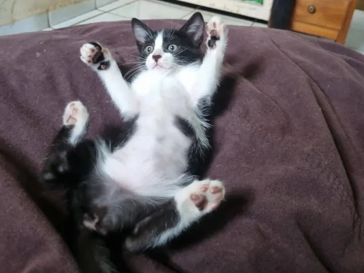 Ela tem entre 3 e 4 meses e é uma das gatinhas mais sociáveis que já vi. Se dá super bem com humanos e convive tranquilamente com um cachorro e um gato que vivem na mesma casa. Dorme abraçadinha com os dois.