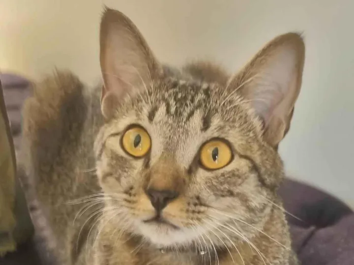 Ele tem menos de 2 anos, com pelagem rajada e porte médio.