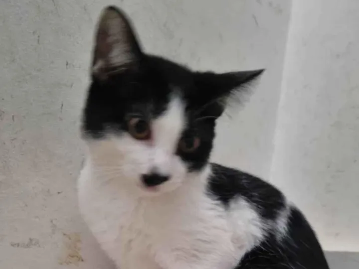 Adote a Narizinho, uma adorável gata SRD de 4 meses, pelagem branca e preta. Ela é dócil, sociável e ideal para apartamentos. Venha conhecê-la!