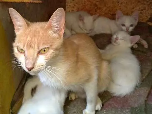Gente eu achei uma gatinha muito magra que conseguiu parir 5 filhotinhos lindos que estão saudáveis: três fêmeas e dois machinhos. Eles devem ter aproximadamente 45 dias a dois meses, ja estão comendo ração.