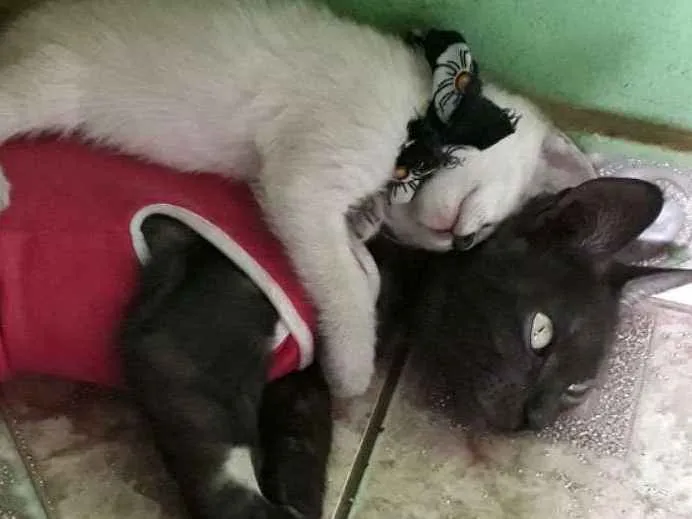 A mãezinha foi resgatada por outra pessoa que trouxe pra mim após ela parir 5 filhotinhos na rua. Um deles é esse grudinho que está com ela na foto, por isso não queria separá-los.