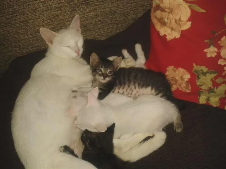 Abrigamos uma gatinha branca que estava grávida. Os filhotinhos nasceram belos e fortes, sendo 1 fêmea branca, 1 macho branco, 1 tigrado macho e 1 tigrada fêmea. Estão em busca de um lar adotivo e afetuoso.