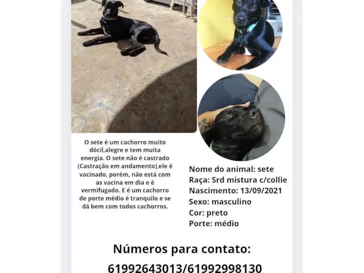 Nome do animal: sete Raça: Srd mistura c/collieNascimento: 13/09/2020Sexo: masculino Cor: pretoPorte: médio Castração: não é castrado
