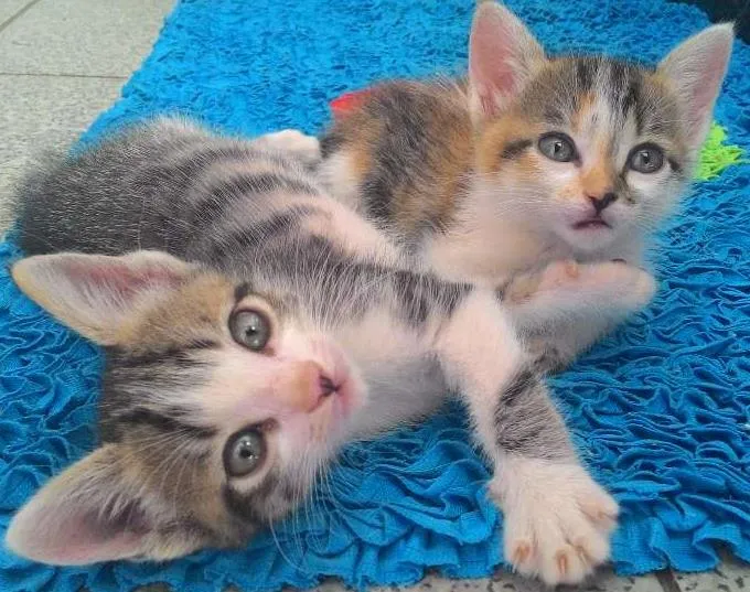 Resgatei dois gatinhos no meu condomínio. Sininho é a fêmea tricolor e Peter é o cinza. Ambos estão vermifugados, e já se alimentam de ração. São dóceis, adoram brincar e carinhosos. Já utilizam a caixinha de areia.