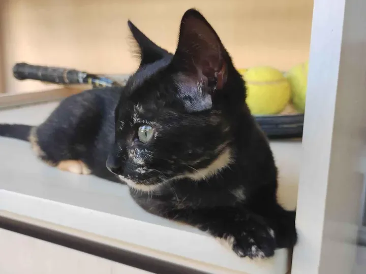 Viti, gatinha preta com manchinhas brancas super charmosas, precisa de uma família. Sabe usar caixa de areia e é super carinhosa. É só pegá-la no colo que ela começa a ronronar. Já testou negativo para FIV e FeLV. Tem entre três e quatro meses e nós garantimos a castração e as vacinas dela. Está na Asa Norte, mas nós podemos levá-la a qualquer lugar no DF.