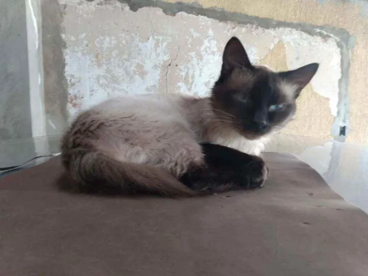 Procuro meu gato Siamês. Nome: Branquinho. É adulto pequeno, olhos azuis, cor branco-creme, gosta de correr. Mia baixo, quase não dá para ouvir, miado afinado quando se ouve, às vezes parece rouco. Gosta de carinho. É atencioso.