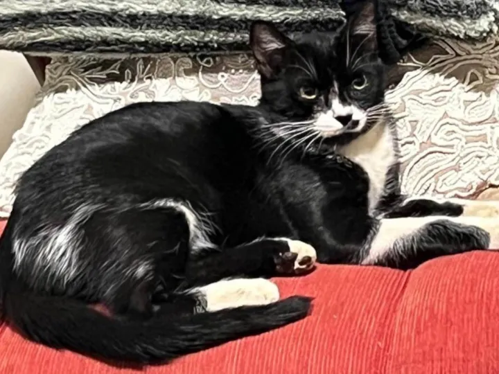 Um frajola que tem uma pinta preta no lado direito do focinho