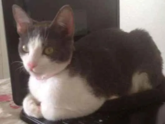 Pelagem cinza com branco (entre os olhos, peito e patas dianteiras branco), (costas, Rabo cinza, algumas manchas nas patas traseiras em cinza também). Tem porte pequeno e magra. FOI OPERADA EM ABRIL DO FÊMUR DIREITO. Estava em processo de reabilitação. Esta com pino no osso que precisa ser retirado com nova cirurgia. Apresenta otite. Estava sendo tratado. Olhos verdes. Mansa.
