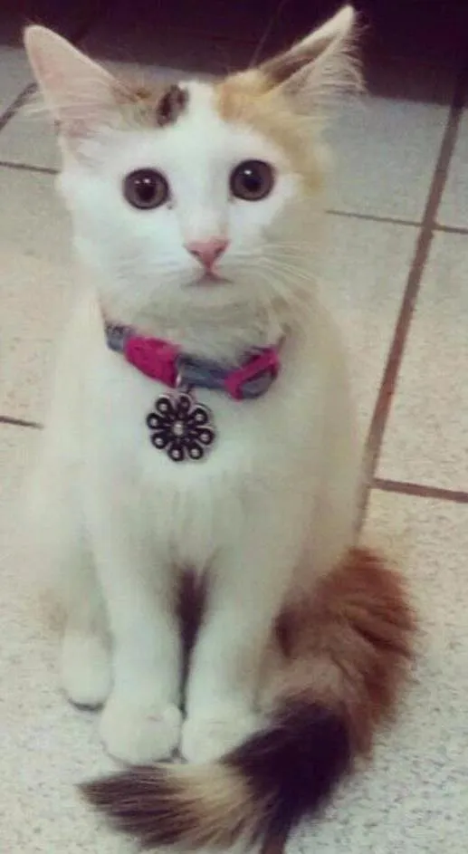 Valentina é quase toda branca, mas o rabo é marrom e preto, tem uma macha marrom perto do rabo, uma marrom e outra preta, na cabeça, e umas marchinhas pretas nas patas (só pereceptíveis, se levantar as patas).