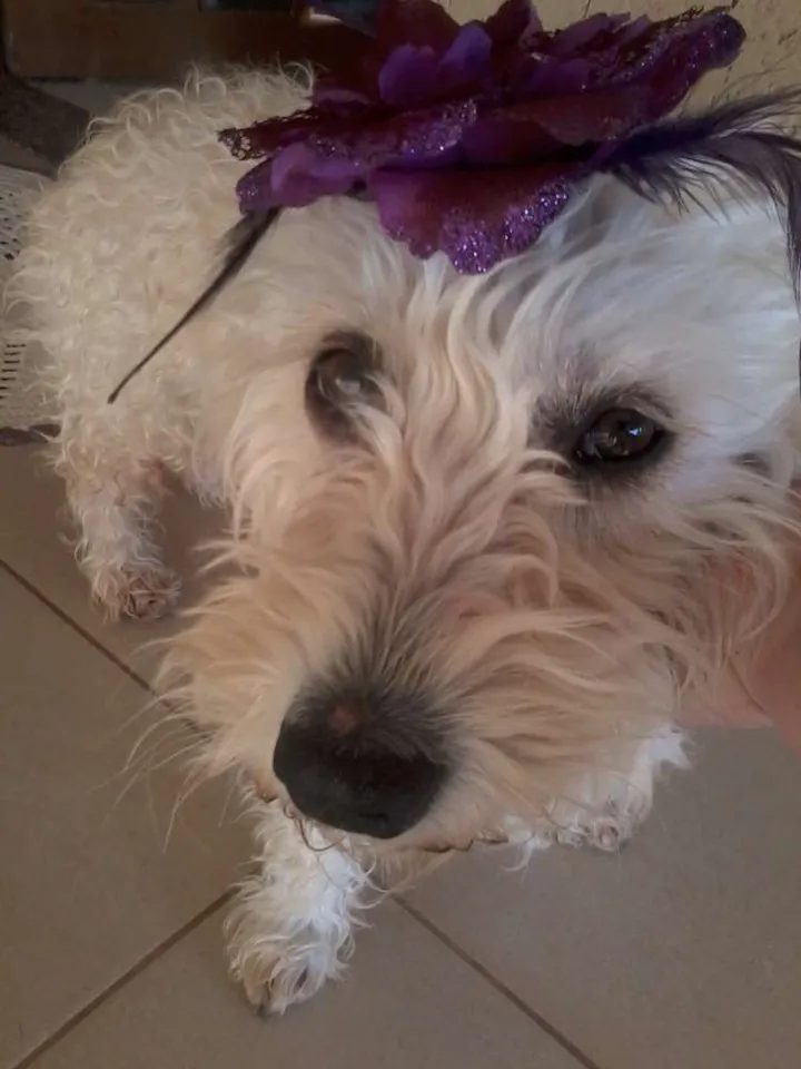 A Princesa é muito meiga e carinhosa. Vive na rua e por pouco não foi atropelada hoje. Seu dono não quer ela por motivo da sua esposa que não aceita a cadela em casa. Fico comovida com a situação e já não posso ficar com ela, pois tenho um macho e meu esposo também não aceita mais um cão.