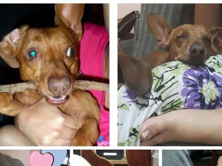 Ele tem uma orelha aí fica em pé e a outra abaixada, ele so anda com a cabeça baixa, tem um olho que ta com uma mancha branca dentro e falta um dente na parte de baixo