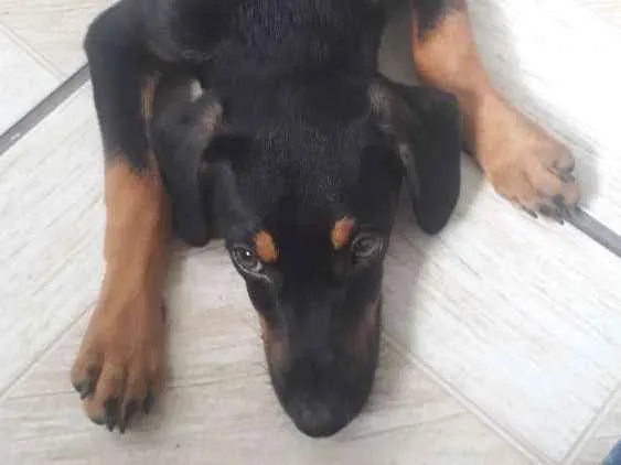 Pelagem preta com patas caramelo, um bebê dócil obediente,muito simpático e é muito brincalhão !