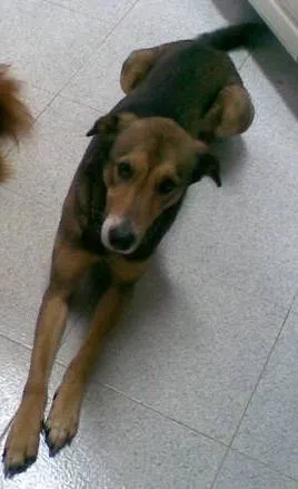 É arraçado de pastor alemão, meigo e tinha coleira de corrente no pescoço.