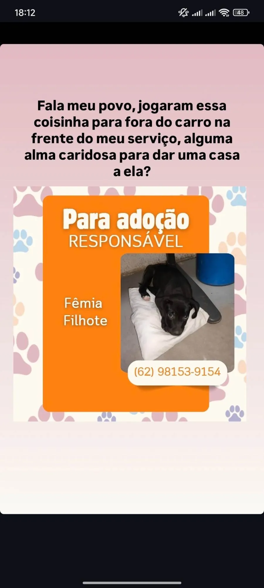 Essa bela cachorrinha foi jogada de um carro na frente de meu serviço, estou dando lar provisório para ela, já está toda cuidada e escovada, com os dentes e orelhas limpas, apenas esperando alguém para ficar com ela, estou mudando para apartamento em poucos dias e não aceita animais...