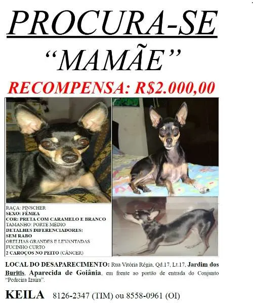 DESAPARECIDA NO JARDIM DOS BURITIS, EM APARECIDA DE GOIÂNIA.PINSCHER PRETA COM CARAMELO E BRANCO, SEM RABO E COM 2 CAROÇOS NO PEITO. SE CHAMA MAMÃE. RECOMPENSA: R$2.000,00.