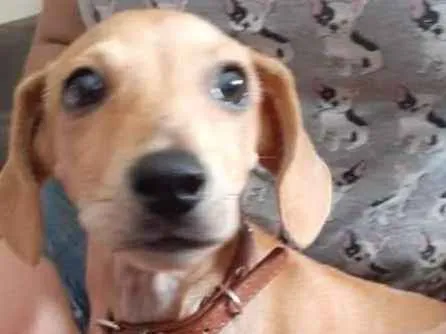 Ela tem uma coleira marrom no pescoço e é super dócil.