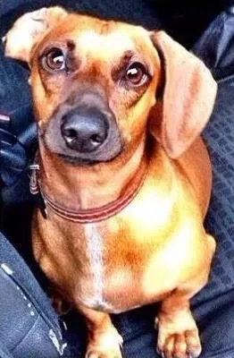 Ele é pequeno, pelagem marrom escuro, foucinho mais escuro e mais arrendondado preto , tem uma lista no meio do peito branca e uma cicatriz acima dos olhos