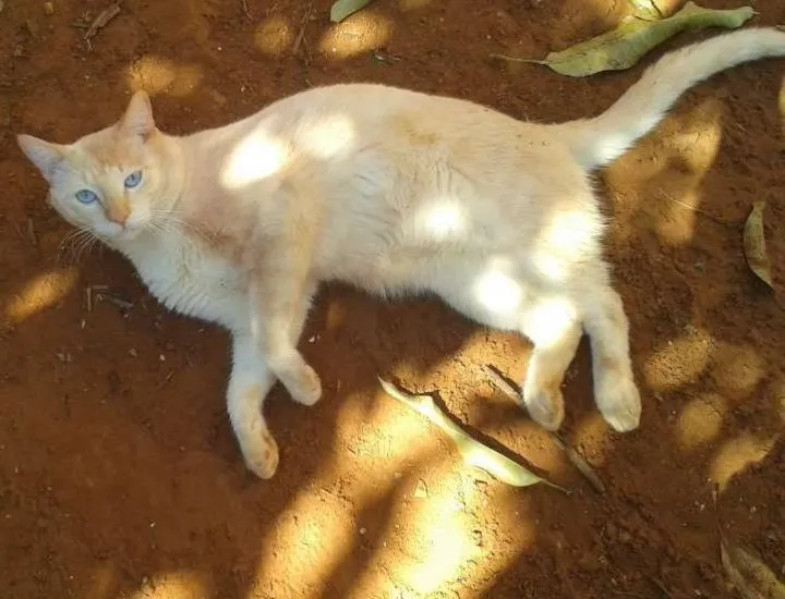 Pelo branco com o o rabo e patas traseiras com algumas listras amarelas, olhos azuis, gordinho.