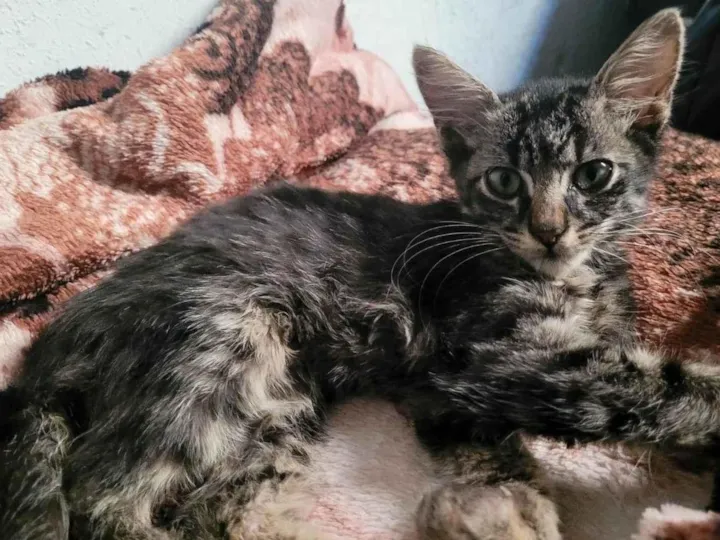 Um gato muito dócil, que já sabe utilizar a caixa de areia, já come ração para filhotes e tem aproximadamente 2 meses. Tem um leve problema na perna traseira mas nada que o interfira
