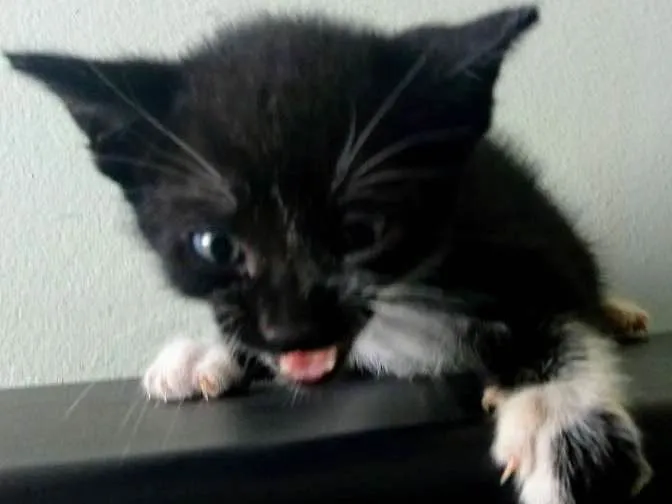 Estou doando esse gatinho preto e branco, ficará com os olhos azuis. A mãe era uma gata de rua e pariu em nosso depósito, não temos condições de ficar pois temos 3 cachorros.