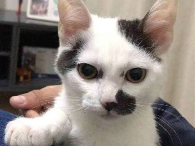 Ele é branco com o rabo mais pretinho, e tem umas manchas pelo corpo preto (como na foto). Super dócil e tb é castrado. Peço ajuda, por favor!