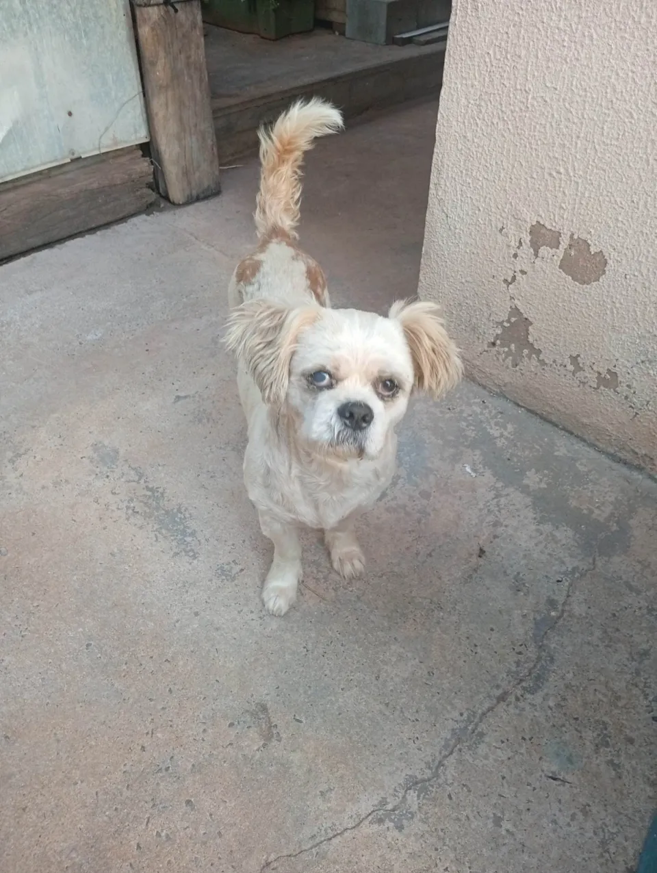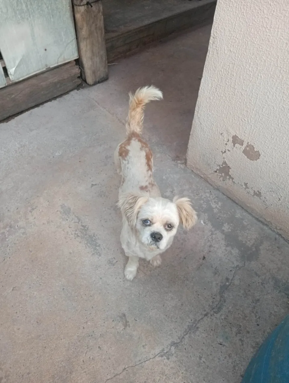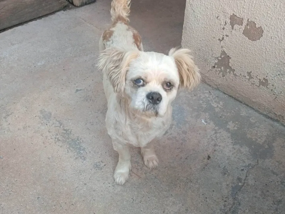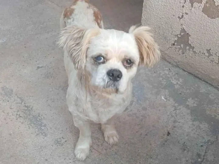 Encontramos um cãozinho da raça Shih Tzu. Ele parece ter cinco anos ou mais, é de porte pequeno e sua pelagem é branca com manchas amarelas nas costas. Não sabemos o nome, ele tem um temperamento dócil e calmo e é bem sociável.