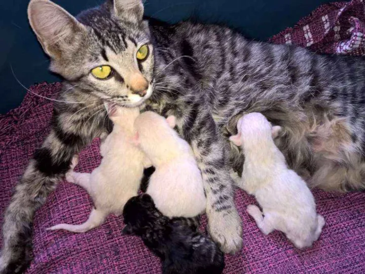 Não tínhamos experiência com fêmea e não imaginávamos que o cio dela seria tão precoce. A Fish ficou prenha, e teve 5 filhotinhos, no dia 17/07/2017, e vamos tentar conseguir lar para eles, pois não temos condições de ficar com os três adultos e mais os 5 filhotes...??