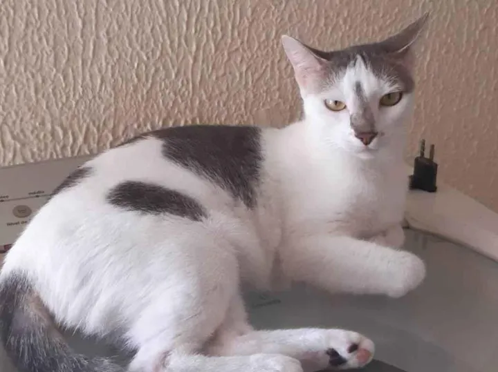 SANSA É CASTRADA, BRANCA E CINZA, TEM UMA PINTA CINZA EM FORMATO DE TRIÂNGULO NO FOCINHO, EM CIMA DA CABEÇA E NAS ORELHAS A PELAGEM TAMBÉM DE COR SEMELHANTE A CINZA ESCURO, PARTES ARREDONDADAS DE CINZA NO DORSO, RABO CINZA ESCURO UM POUCO RAJADO, NÃO TINHA HÁBITO DE SAIR, DEVE ESTAR COM MUITO MEDO.