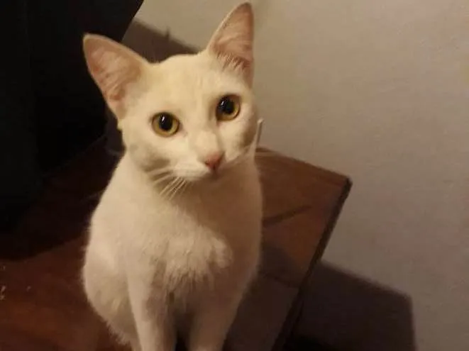 Ele, tem o pelo inteiro branco, olhos amarelos, desapareceu na rua Coronel Pedro Correia, centro , enfrente a lagos e embalagens, Alfenas MG , podendo estar pelas redondezas, ele tem problemas de figado, come ração especial, não pode comer qualquer coisa , quase morreu por causa disto.