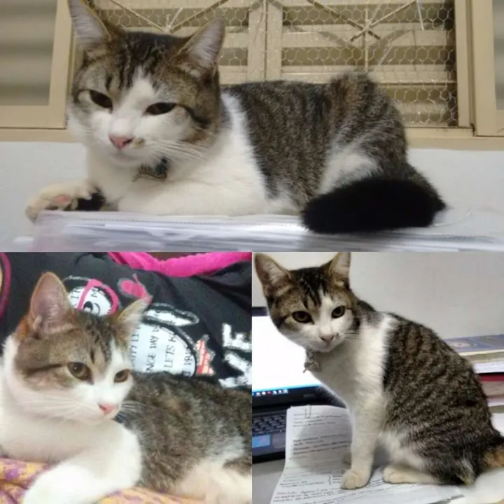 Tem a frente branca e as costas rajada de cinza com preto, com uma machinha próximo ao foucinho e o olho é amarelo. É castrado. Ele fugiu dia 15/11 as 22h na av Lincoln westin próximo a plug.