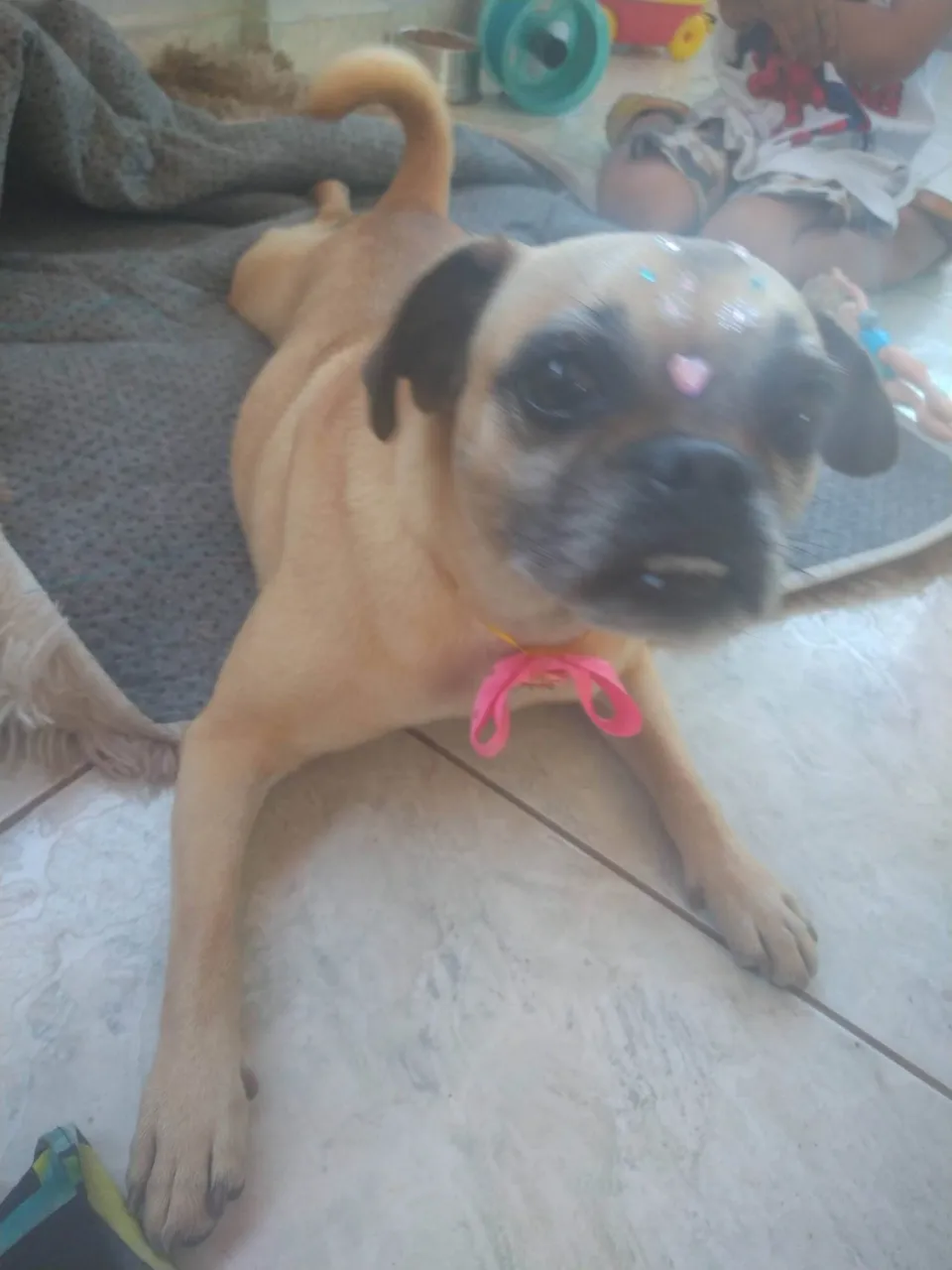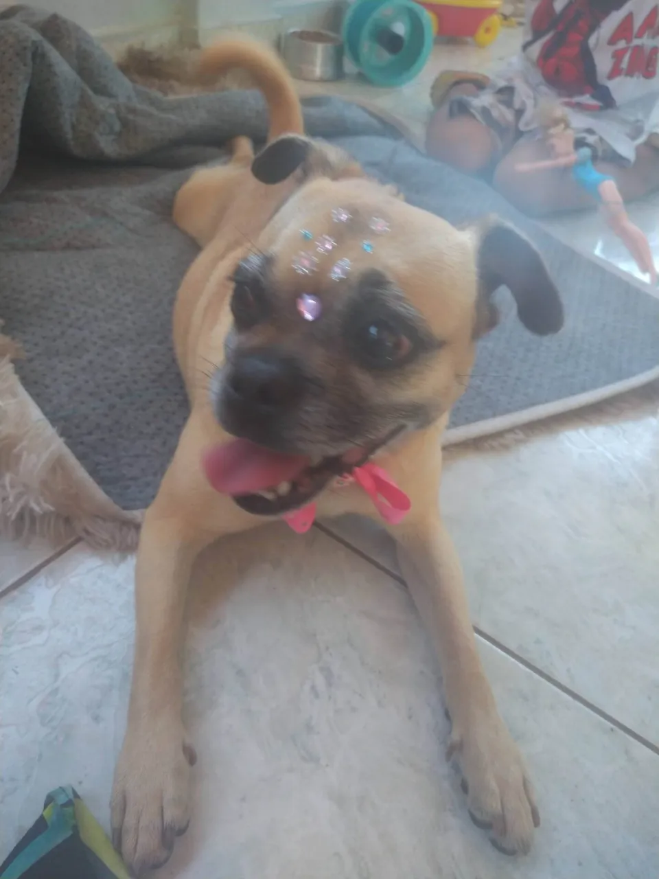Achei a Dandara na rua a cerca de 1 ano então adotei, ela é muito dócil muito esperta obediente também , ela é mistura da raça Pug convive bem com todas as pessoas principalmente crianças ela adora crianças adora brincar, já dei vacinas e também é vermifugada.