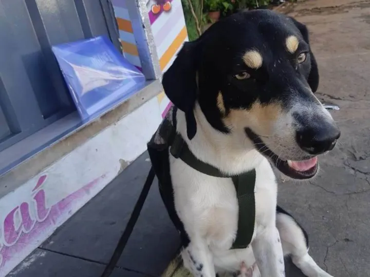 Cão sem raça definida jovem, macho, não castrado, de porte grande, muito dócil e brincalhão. Olhos cor de mel , pelagem brilhante, preta e branca, unhas aparadas, bem tratado.