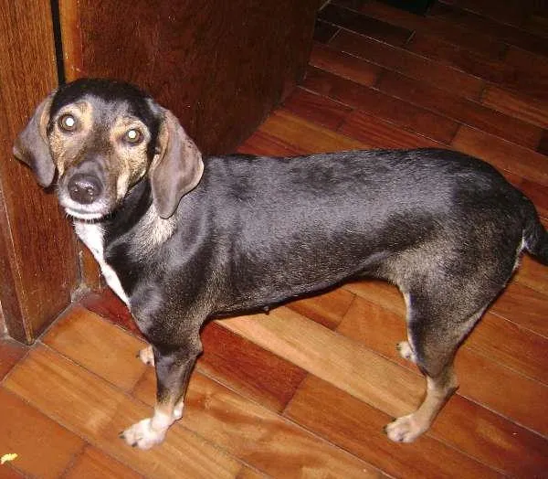 pelo preto com peito branco, e patas branco e marrom. tem medo de trovao e foguete, e muito esperta e pula muro com muita facilidade, parece um gato! tem rabo longo e a ponta do rabo faz uma voltinha.