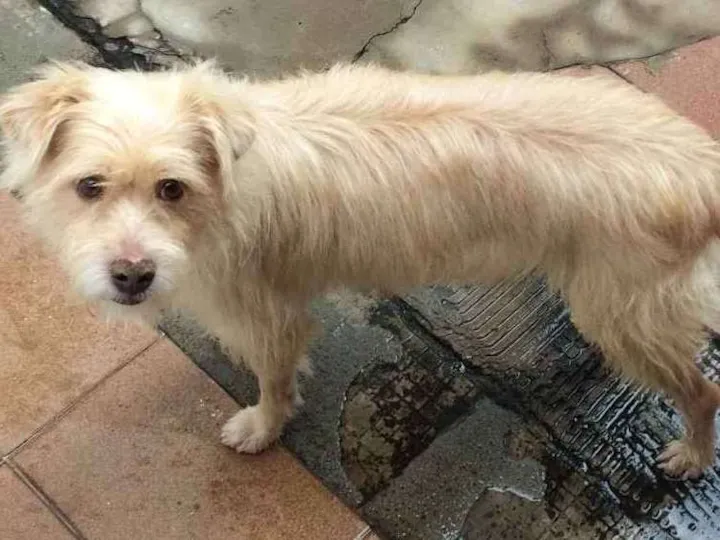 Procuro cão mestiço, parece poodle, cor bege, tamanho pequeno a médio, rabo e pelo compridos, castrado.
