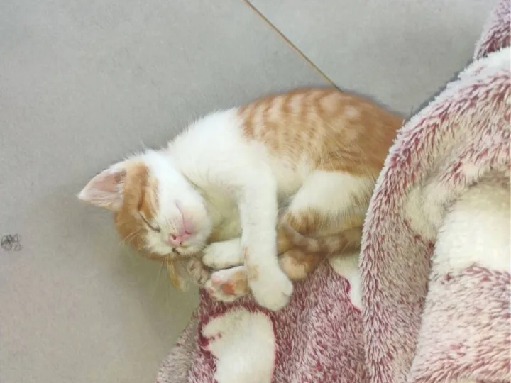Ele foi encontrado abandonado na rua com fome e bastante pulga, estava chorando e alimentamos ele com leite de caixinha pois não conseguimos achar comida pra ele.