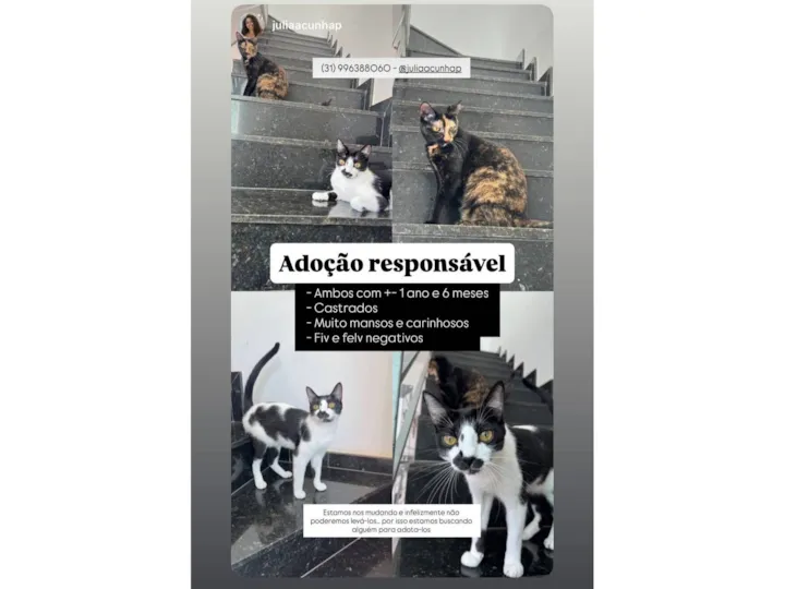 Estamos em busca de um lar responsável e acolhedor para nossos gatos, Sophie e Jorge, ambos SRD e com menos de 2 anos de idade. Eles estão conosco desde filhotes e são muito queridos pela nossa família.Infelizmente, devido a uma mudança de país, não teremos condições de levá-los conosco. Por isso, estamos procurando uma solução segura e cuidadosa, seja um lar temporário ou definitivo, onde eles possam receber amor, atenção e os cuidados que merecem.
