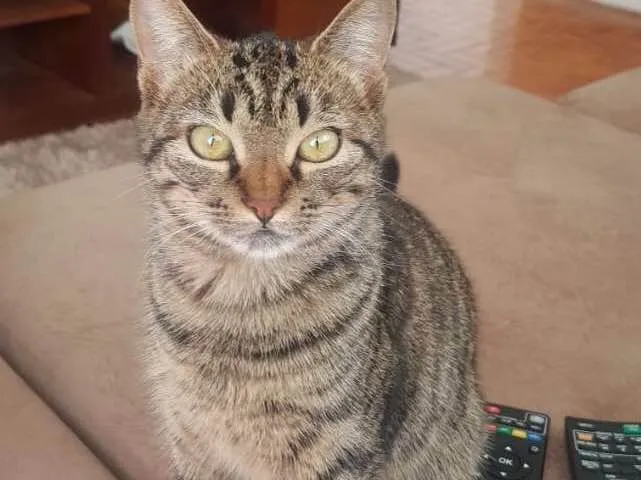 Gata rajada (cinza com partes amarronzadas), caiu da janela do apartamento. Vizinhos informaram que ela apresenta ferimentos na mandíbula, estava com dificuldade para caminhar. Atende pelo nome Dominique, vista pelos vizinhos até a noite de sábado na rua São Bartolomeu com Horta Barbosa, no bairro Nova floresta em BH.