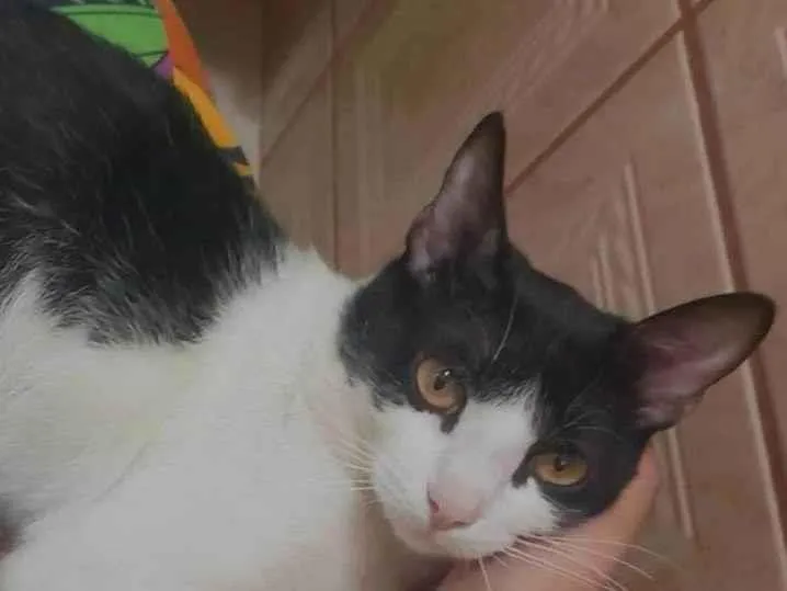 Gato preto e branco, dócil e estava com uma coleira vermelha. o mesmo tem 2 cicatrizes por conta da esporotricose, uma na parte de cima perto do rabo e outra perto da cabeça na parte de cima também.