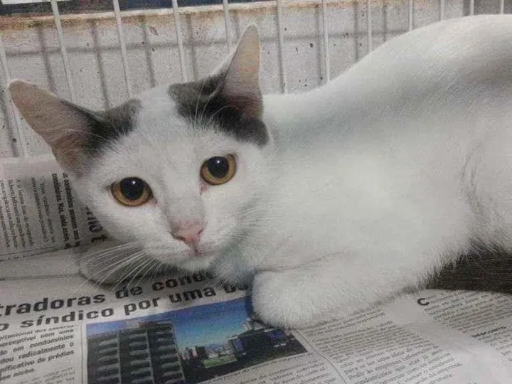 ELA É BRANCA, O RABO É CINZA ESCURO E TEM DUAS MANCHAS ENTRE AS ORELHAS, TEM LINDOS OLHOS AMARELOS "PUXADOS" PRA CIMA. É UMA GATINHA DÓCIL, TÍMIDA E ASSUSTADA...