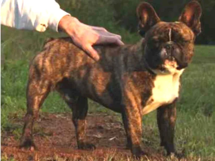 Descrição: Cachorro Bulldog Francês Marrom TIGRADO, tem uma manchinha pequena no focinho do lado esquerdo (olhando de frente). Não castrado, sem rabo, cor escura.
