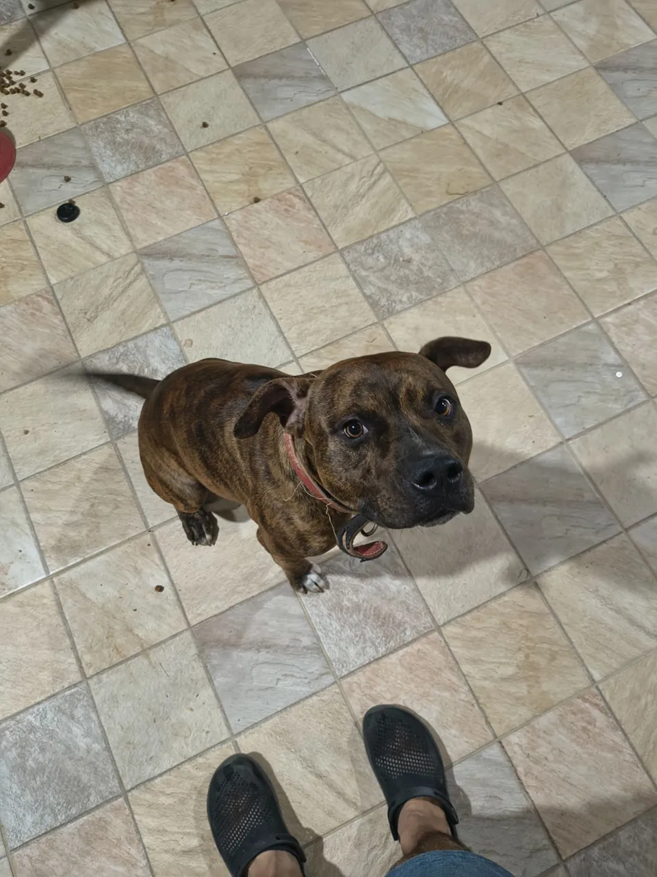 Ele tem um ano e cinco meses. E dócil, brincalhão, carente, respeitoso, mas estranhou minha esposa, ele não a reconheceu por pouca luz, nosso quintal é grande. Ele fica no canil durante o dia e solto por volta das seis e meia quando chego em casa. Teve uma ocasião e era de dia ainda, ele estava no canil e tinha uma pessoa estranha pra ele ao meu lado, ele estava com fome eu creio, não tinha colocado ração pra ele pela manhã, aí quando cheguei com a ração, abri o canil e coloquei a vasilha dele lá dentro beirando o portão, aí quando fechei e levantei, fui mexer com ele por cima da grade, ele rosnou pra mim e ficou latindo pra mim agressivamente, a pessoa estranha pra ele estava logo atrás de e ao meu lado, mas ele ficou latindo pra mim mesmo, e teve esse episódio de latir pra minha esposa uma semana depois. Então não confio mais nele, ele é lindo, fico chateado mas não quero arriscar.