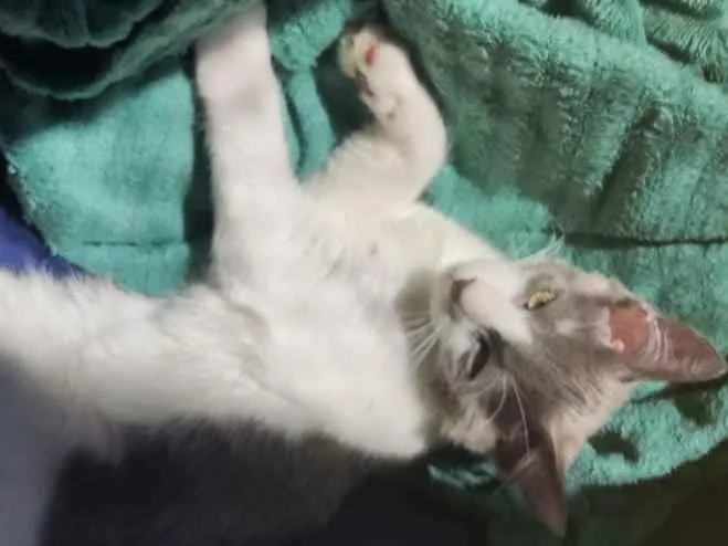 🐾✨ Conheçam o adorável Topokí! Este pequeno príncipe de pelagem branca e cinza é puro amor e alegria! Com apenas alguns meses de vida, ele traz um brilho especial a qualquer lar. Topokí é dócil, calmo e brincalhão – a combinação perfeita para famílias que buscam um companheiro felino carinhoso e sociável. 💖