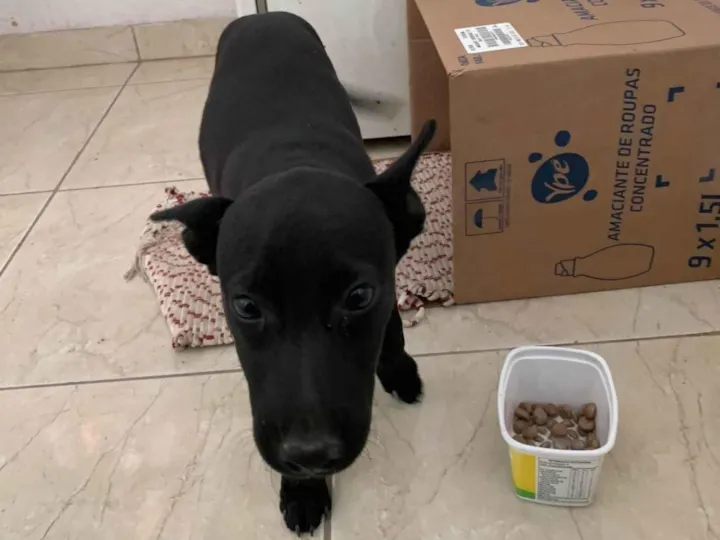 Encontrei uma filhotinha de cachorro, aparentemente da raça SRD, com pelagem totalmente preta. Ela parece ter menos de dois meses e é de porte pequeno. O que mais me chamou a atenção foi o seu temperamento incrivelmente dócil e calmo. Apesar de ser um filhote, ela adora brincar e está sempre procurando algo para se entreter, demonstrando um espírito brincalhão e alegre.